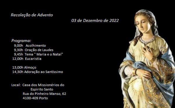 Recoleção de Advento+ Add to Google Calendar+ iCal / Outlook export DateDez 03 2022Expired! Time 9:00 - 16:00 LocalEspiritanos no PortoRua do Pinheiro Manso, 62 - Porto Categorias Família EspiritanaShare this event