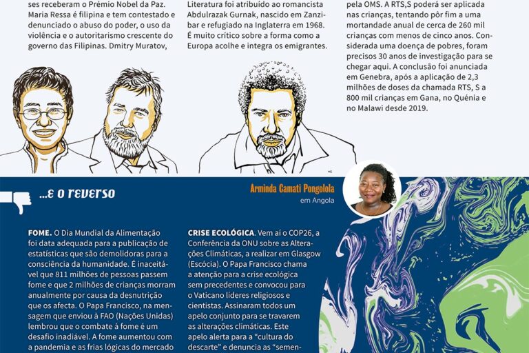 👍 Nobéis da Paz e da Literatura 👍 Vacina contra a Malária 👎 Fome 👎 Crise ecológica